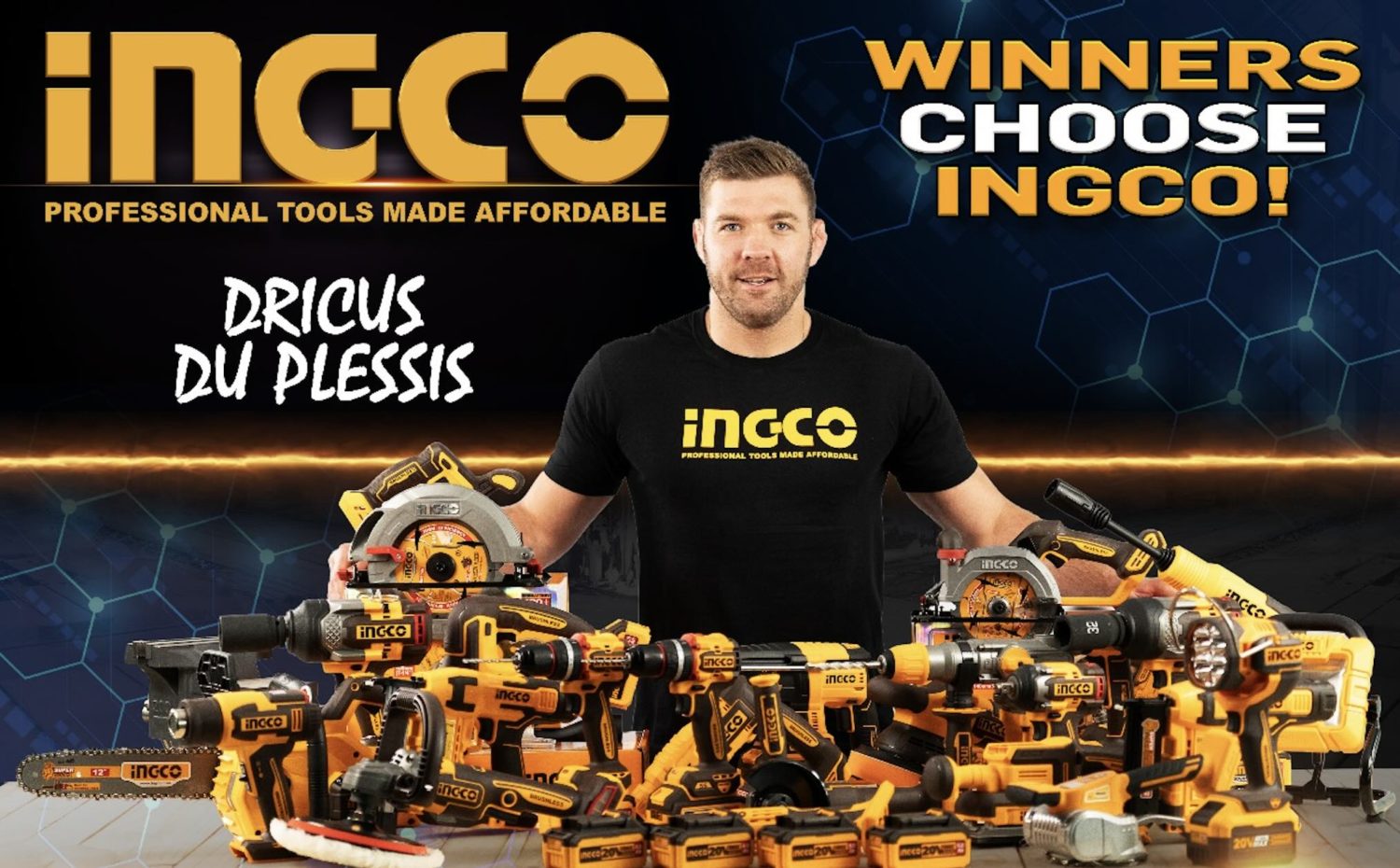 “It’s a sincere honour being part of the INGCO family – it’s the tools we know and trust,” said Du Plessis. “On the tracks and in our homes, on a professional level, thank you INGCO for supporting the proudly South African sport and culture we cherish.”